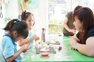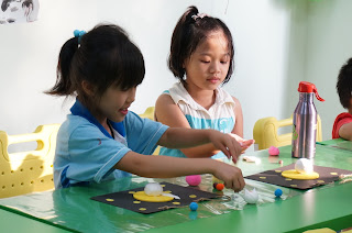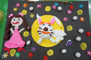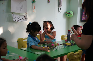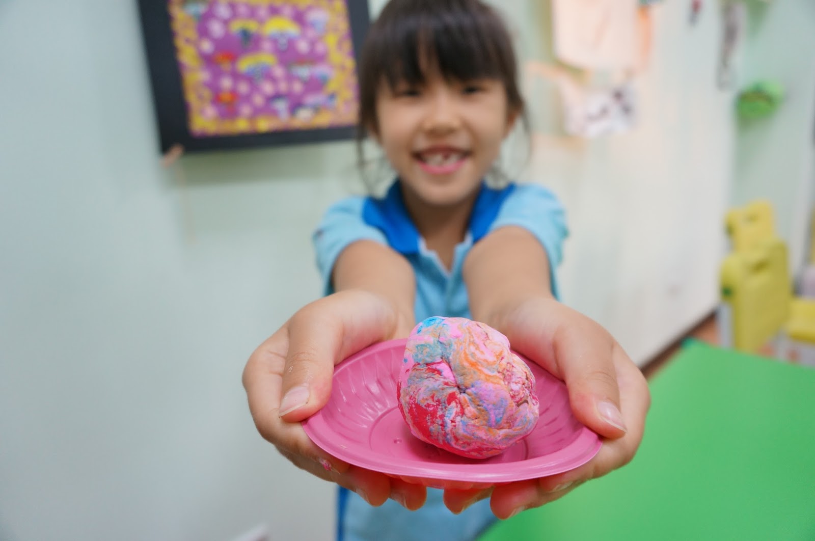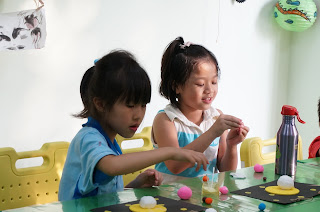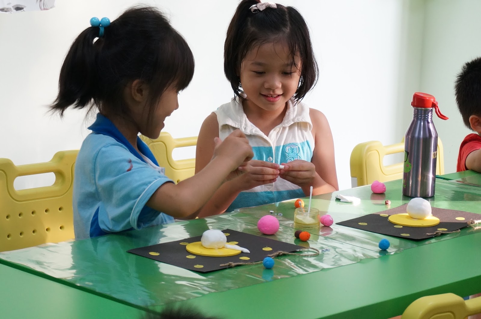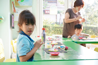 曼瑄和隔壁同學很開心地玩了起來 (一起捏黏土)